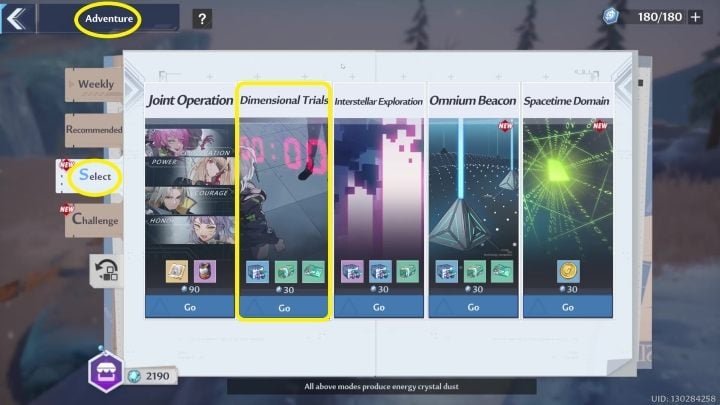 To start Dimensional Trials, you must first enter the Adventure menu (upper-right corner), then the Select tab. You'll learn more about the Adventure menu on a separate page. Remember that you need to be at least level 23 to access the challenge.