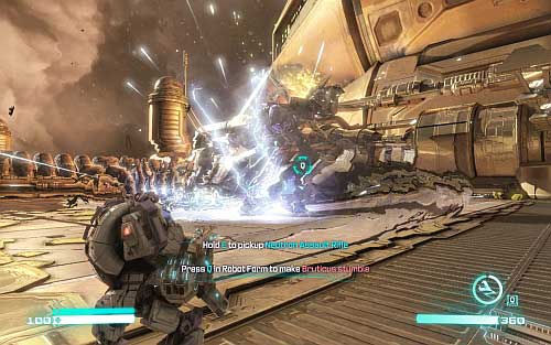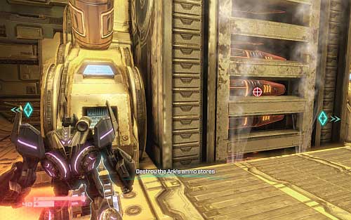 From now on you will control Jetfire. Fly out from base and move toward cables linked with Ark. Shoot at them until weak point shows up (picture). Shoot it down by firing in these targets and do the same with other cables. During this watch out for Decepticon's flying units.
