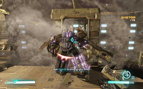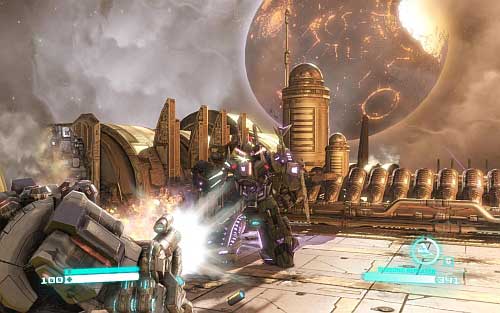 This time you will control Jazz. Move to the pointed wall, change into the robot and use grapple to get higher. Move forward until you get to the square with Bruticus. He will attack you immediately - he can use sonic attack, flamethrower and artillery (if he does that don't get into the red circles on the ground). Try to move all the time and use grapple to get on the catwalks. Shoot at enemy's head (picture) and when he will be befuddled use grapple on marker point, jump onto him and press left mouse button to shoot him.