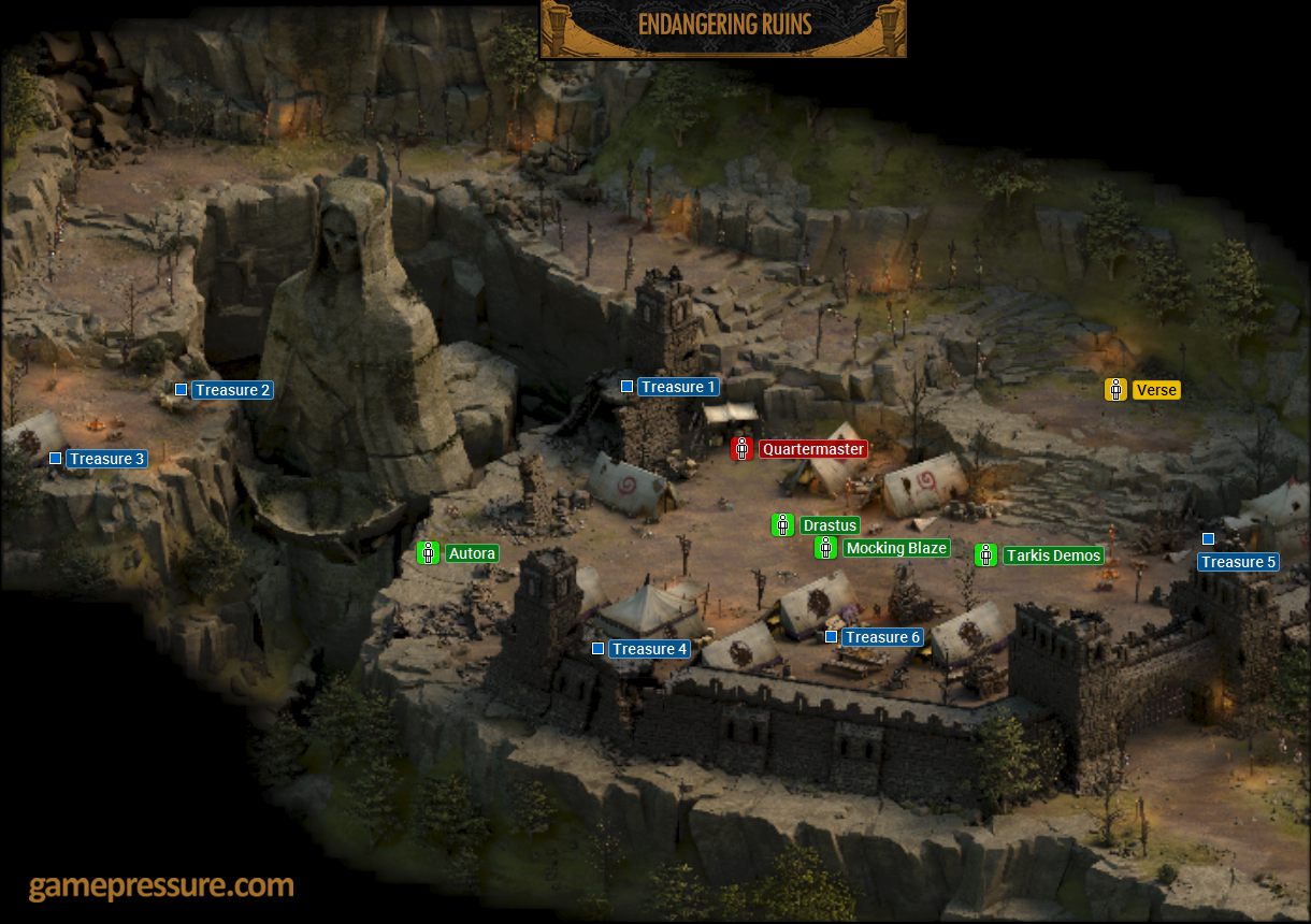 The above map presents Edgering Ruins, your starting point in Tyranny. Here, you will learn the gameplay basics: dialogues, combat, shaping your reputation, interaction with game world and obtaining new companions.