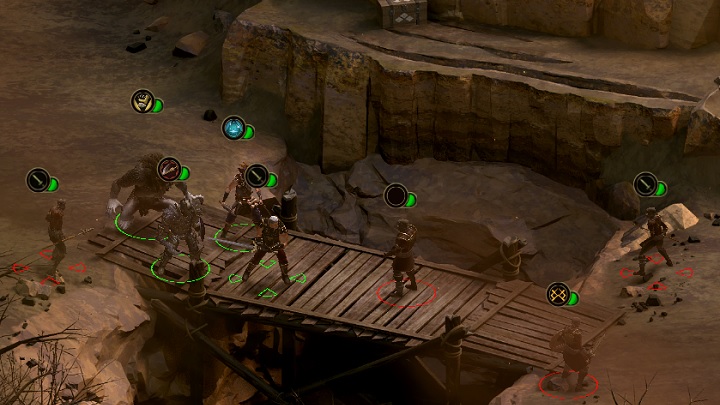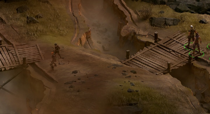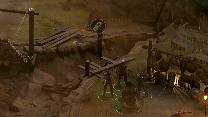 When you're done, you will be able to perform a ranged attack and hit the mechanism of the bridge (required 41 Athletics). This will destroy the mechanism and lower the bridge. Now you can safely reach the rest of the Unbroken and the commander of the encampment. After a short conversation Elia will retreat to a further part of the location and the passage will be blocked by another group of Unbroken.