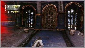 This way, you'll get to a chamber full of human remains. Leave the room by walking through a corridor with statues, bypass the fountain and go down the stairs to see your enemies in the distance [1].