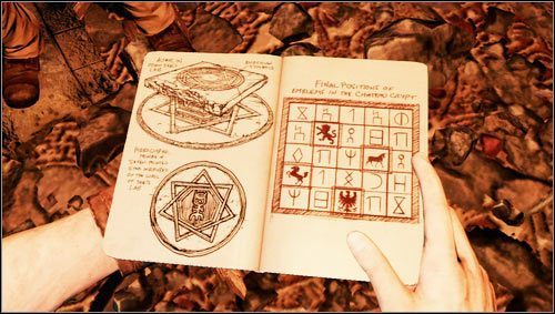 On the floor there are stone slabs with symbols. By looking into the log we learn that in order to activate the mechanism that opens the secret passage, we must properly move from the initial symbol (yellow moon and wheel) to the final symbol located at the opposite end of the room [1]. Along the way, we must stand on the right amount (also indicated in the notebook) of the symbols while sticking to the specified order.