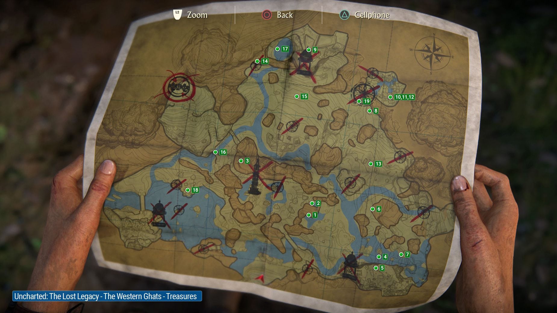 In this page you can find all secrets in Uncharted: Lost Legacy that can be unlocked in the fourth chapter called "The Western Ghats". The map above should help you during your searches for the treasures. There are 19 of them to unlock in this chapter. You can reach them in the order described in this guide or you can get them in your own order because chapter four gives you a lot of freedom in exploring the area.