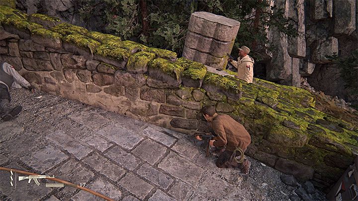 Climb to the higher part of the ruins, walk through them and move on. When you get to the cliff, grab nearby edges and use them to get to a small stone shelf. Use your grappling hook, turn Nate left and start swinging towards the vertical wall with prominent objects that your hero can hold on to. Slide down and carefully approach a group of enemies, which consists of three mercenaries.