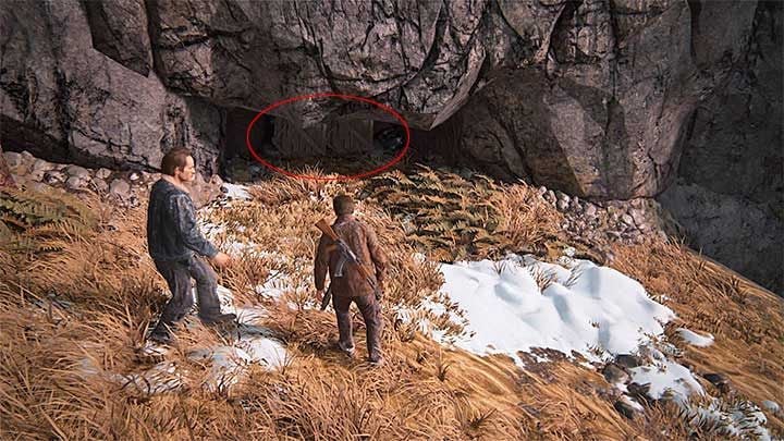 You will have to perform a sled run in straight line and grab stone shelves situated on the other side of the steep ground. You need to get to an interactive tap where Nate can use a grappling hook. Slide down the rope to reach a small campsite. Nate and Sam will be ambushed by several mercenaries, so take cover behind nearby crates. When you deal with your enemies, head left and soon you will reach a larger excavation. Before you begin exploring this area, get to a cliff located behind the ruins. Turn right and find bushes presented in the screenshot. Collect Carved Wood Kashkul.