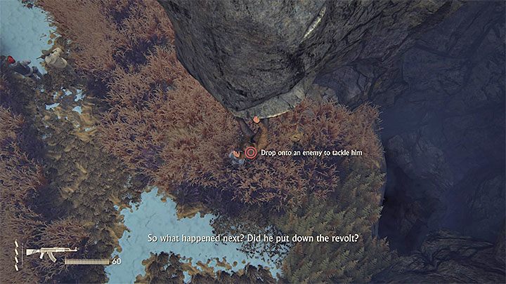 The key problem is that one of the mercenaries is a sharpshooter. Although the laser scope will reveal his location, it is best to stay hidden for as long as possible. You should start by sneaking up to the closest opponent who is directly in front of you. You can hang by the edge and pull him down. You may also investigate a small cave located right under this place. If you do, you will find a pistol and some dynamite.