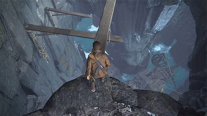 It won't take long before you have to ask Sam for help and unlock the partially blocked passage. Soon you will exit the small cave and begin to slide down (you will need to jump towards an interactive edge at the end). Use your grappling hook to reach a shelf above. You will get to a huge abyss, at the bottom of which is a shipwreck. You will get through this location via narrow wooden bars. Take your time not to fall down.