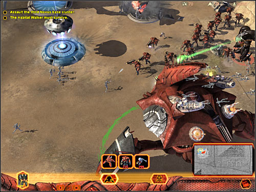 Now you'll finally find out more about the most interesting aspect of being able to command Hierarchy units. You will have to wait for your leader to grant with a possibility of using a Walker (4 on the map). You will be allowed to take full control over it. Before you decide to proceed any further, make sure that you've familiarized yourself with the basics (question icons). You should listen to a few hints and don't forget that you can see a movie about Walkers. It's accessible from the main menu of the Tutorials section. Click on your newly acquired unit and you should notice that a lot of icons have appeared on the screen. Those are called hardpoints. You will be able to fill them by buying various types of components. I'd strongly recommend filling all slots, so that the Walker isn't exposed anywhere. You should also remember that placing a few modules of the same type allows you to increase their overall strength.
