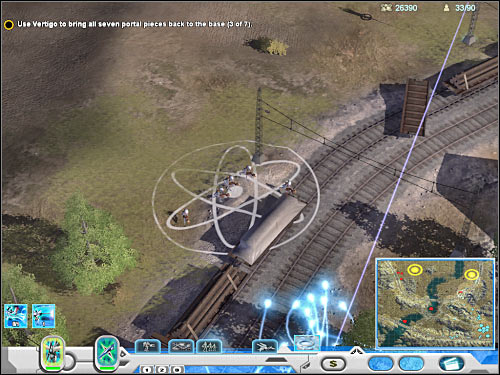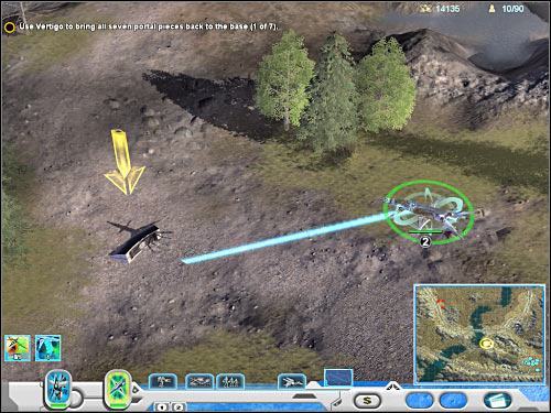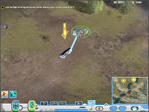 Now you should focus your attention on obtaining the fourth piece of the portal. It can be found to the north of your position. That's where enemy Walkers appeared in the first place. Sadly, you won't be allowed to send Vertigo there right away, because the artifact is probably being guarded by a few Lost One troops and they're fully capable of destroying air units. Allow Viktor to get there and use your missile strike ability to get rid of alien creatures (screen). Once this is done, allow Vertigo to pick up the fragment. Obviously you will have to transport it back to your base.