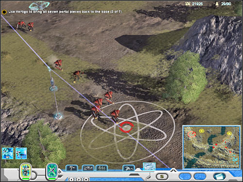 The sixth fragment is located to the north of your main base. I would recommend going there in a straight line, because you'll find an alternative route which leads to an enemy base. You'll have to use it in a few minutes, so it's best to know where exactly it is. Vertigo will probably encounter several Grunt units along the way. You may try neutralizing them or you may focus only on collecting the sixth fragment of the portal. Obviously you will have to transport this object back to the base. Now you must continue building your army, so you'll achieve the limit which is 90 points (points doesn't equal units, because larger units take more than one point).