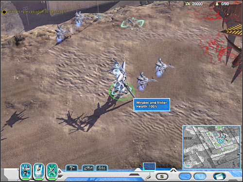This is the final mission of the Novus campaign. As you've probably suspected, it's going to be difficult. This may come as a surprise, though, because some of the previous missions of this particular campaign very extremely easy and didn't require you to act in a lot of hurry. You will have to make quick and accurate decisions. Having a steady flow of new units will also be very important, because your starting units are going to die (sooner or later). It's also extremely important to keep your main heroes alive. Losing any of them is going to be equal to an instant failure. Once you've regained full control over your units, you will only have 30 seconds to prepare for the arrival of the first wave of enemy Walkers. As you've noticed, Vertigo has automatically picked up Mirabel using its Upload ability. Move back all of your units to the main base. You may consider allowing Mirabel to go back to the battlefield by choosing the Download ability or you can wait with this decision for the first battle to commence. Right now you should focus only on preparing for the enemy assault.