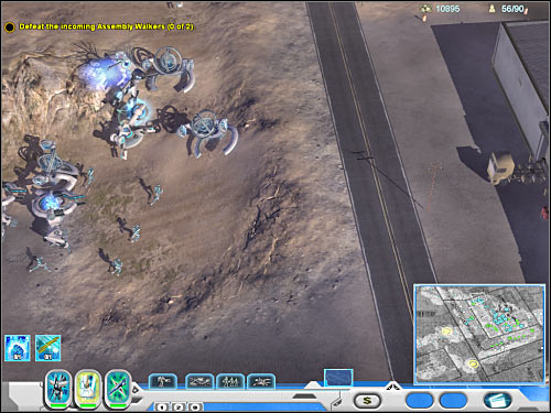 You should receive your first objective in just a few seconds. You'll also notice that two enemy Walkers have arrived in the area (2 on the map). This means you will have to act quickly, because they won't stop at nothing. Instead, they are moving continously towards your base. I would recommend taking care of the western Walker in the first place, because reaching your base is going to take it less time. Order your army to leave the hill and wait for your troops to get closer to the position of the Walker.