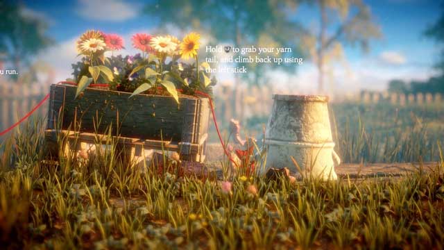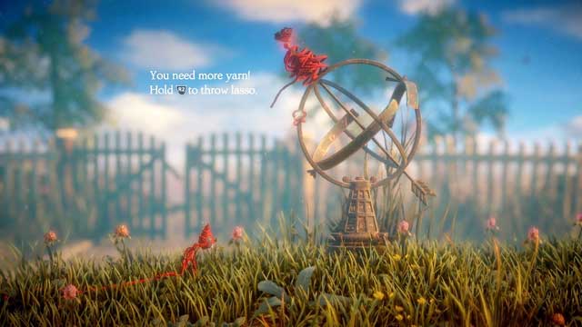 The game will guide you through the first level. Here, you'll learn the basic rules of the game and the functions that you can perform. First, you must learn to use the lasso. It will allow you to get to higher places and jump over precipices. However, you can only hook your lasso string to red loops made of yarn. Since the character leaves behind yarn, you must replenish it to be able to go on. Such additional balls of wool can be found from time to time along the way. They are also checkpoints, to which you can return to at any time if you decide that something went wrong (using an appropriate key, not the "Restart" button in the menu).