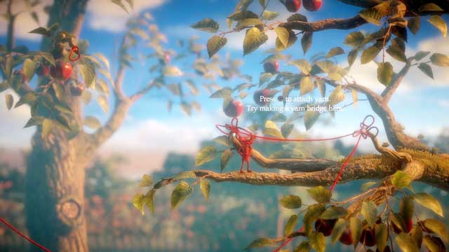 In a moment you will come across a tree. To go up, use the lasso the same way you do it to jump over precipices. If you don't succeed, grab the thread with your hand and go back to the previous ledge. The thread can also be used to build bridges and trampolines by hooking it (action key) on two nearby ends. To take off, use the "down" key.