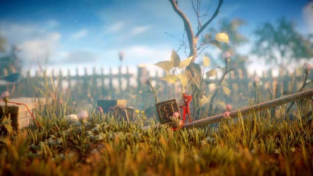 Before you jump on the second trampoline next to the birdhouse, jump down behind the tree. In the corner on the right there is a thistle bush. Grab it with the lasso and pull to the left to break the stem. Then you will be able to collect the button located there - it's a collectible item.