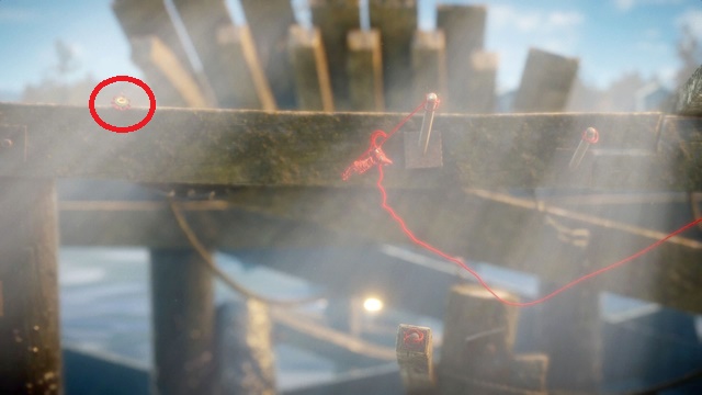 At the end of the section featuring the sea, tie knots on two posts to create a trampoline. First, however, you can swing on the taut thread on the last post to get the button located to the left.