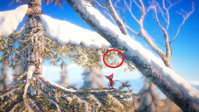 After starting the level and walking a few steps you will come across the first button. If you take off from the snow-covered branch pointing to the left and avoid any unnecessary movements, you will hit it perfectly (it's hidden in the snow on a high branch). If you miss it, quickly lasso one of the two loops on the branches.