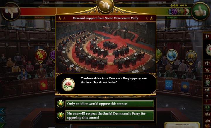 First of all, note why certain parties oppose or support the motion. You can do that by pointing the cursor at the symbol of any party, which you will find on the support axis. Most often the initial opinion will be dictated by the political compass and in this area you will not be able to act, but it is worth familiarizing yourself with the value of this modifier, as in most situations it will be the value you will have to counteract with your own actions, in order to convince the party members to support your motion.