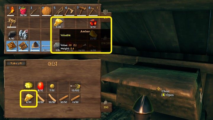 Remember that when using this method, resources or items will be automatically added to previously deposited stacks. In the image above, you can see that after storing amber, the items from the inventory will be added to those previously stored in the chest. If the stack is full, items will be assigned to the next free slot.