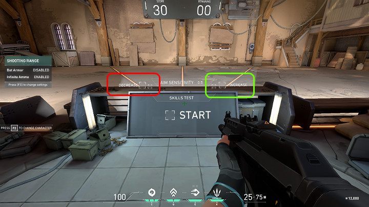 After entering the shooting range, you will appear in the spot shown in the image above. Go to the shopping menu (B on the keyboard by default) and choose the right weapon - it is best to choose one that can kill a target with a single headshot, such as Vandal. When you're ready, shoot the field next to the "START" sign on the main console and get ready for the test. After a while, bots will appear in the area in front of you. You must eliminate them to earn points - the maximum score you can get is 30 points. After firing a shot, immediately return to the center of the map (the pole shown in the screenshot above) before moving your hand towards the next target.