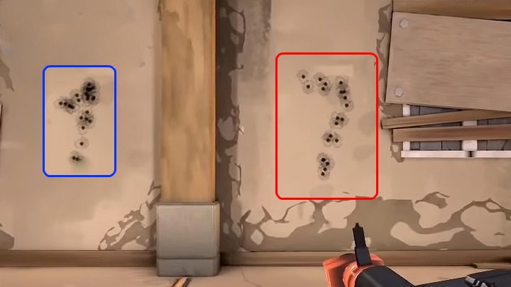 The image above shows an example of the Ares' spread, one of the weapons in Valorant. The test was conducted from a medium distance - the closer the target, the smaller the bullet spread. As you can see, the first 3 rounds are flying more or less near the target - you only need to move the mouse slightly downward to counter this movement. Unfortunately, if you keep firing, the weapon will start moving in all directions (spread marked in red). Crouch to effectively use this weapon at medium range - the bullet spread will be reduced by two-fold (spread marked in blue), and the first 15 rounds will only need to be slightly countered by moving down to hit the target.