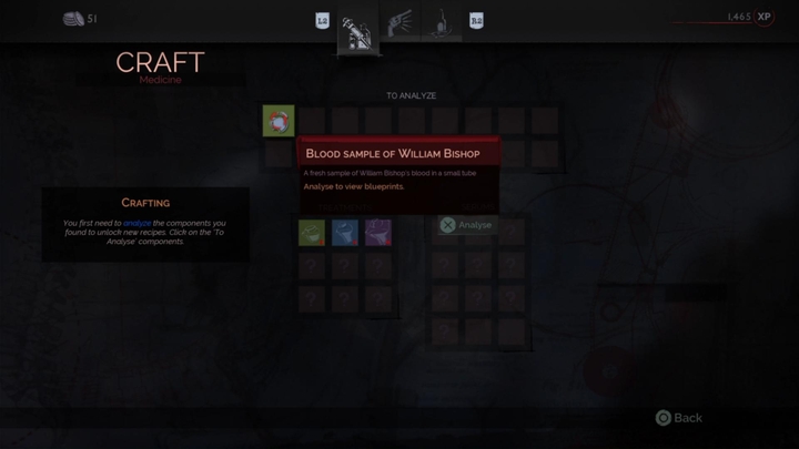 - Go now to your office and use the desk. There, you can craft items (including meds for the sick) and analyze the obtained blood samples.
