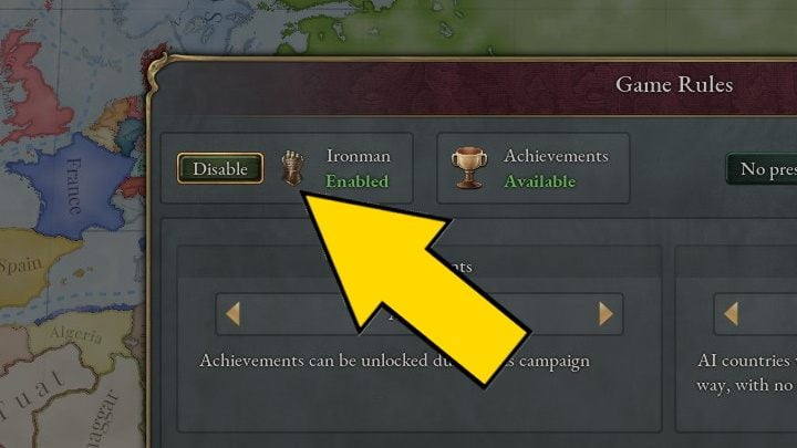 In the case of the Free Mode or other modes of the game with a selected country (not recommended), you will enable the Ironman Mode in the Game Rules tab. Just click the Enable button in the upper left corner of the window. To deactivate the mode, click the Disable button.