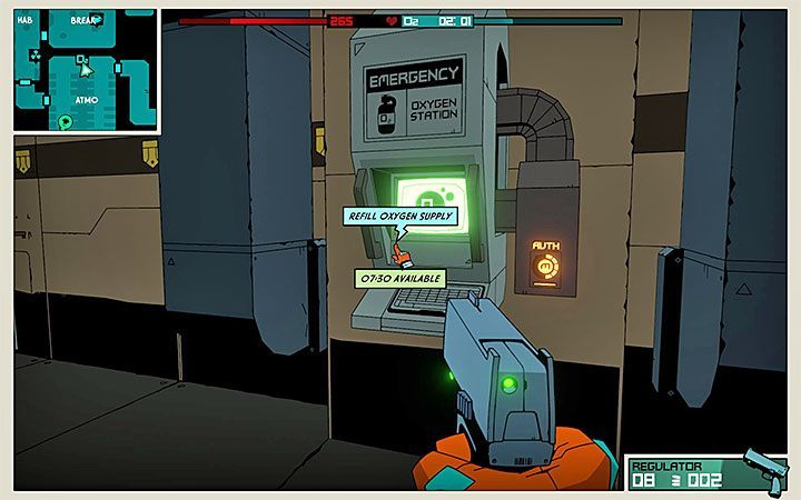 Monitor your oxygen supply. The oxygen supply counter is displayed at the top of the screen. We advise you to watch it especially in the early stages of the game, because by default it only lasts for a little more than 7 minutes. Get to rooms with oxygen tanks (ATMO) to replenish oxygen reserves (example station shown in the image). In the future, the problem of oxygen supplies is not that important due to improvements and genes, which allows to increase the maximum supply of oxygen in the tanks.