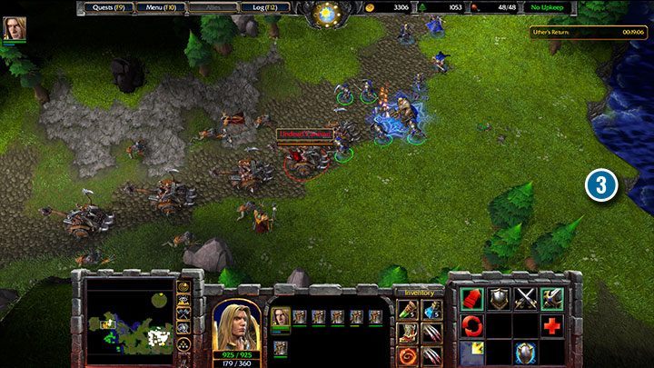 At the top of the map, north of your base, there is an unoccupied gold mine (2). It is not defended, but it will be the enemy's target. An additional task to destroy the poisoned grain caravan will appear about 20 minutes before Uther arrives (3). It is worth destroying this Caravan because it will attack your further expansion and the Undead forces can build their base there - from which they may send out more groups of soldiers.