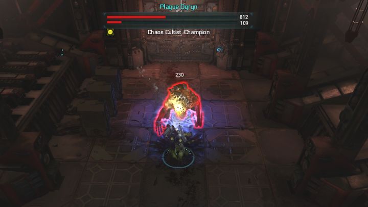 Destroying the barricade will grant you access to a chamber resembling a control room. You will learn how to neutralize the signal jammer, which inhibits you from establishing contact. The solution to this problem is found in the room behind the door. There, you will find a Cogitator, which allows disabling the vox jammer. However, in order to reach it, you will have to slay some Chaos Cultists first. This won't be a difficult task. However, you cannot let your enemies be attacking you from behind the barricade.