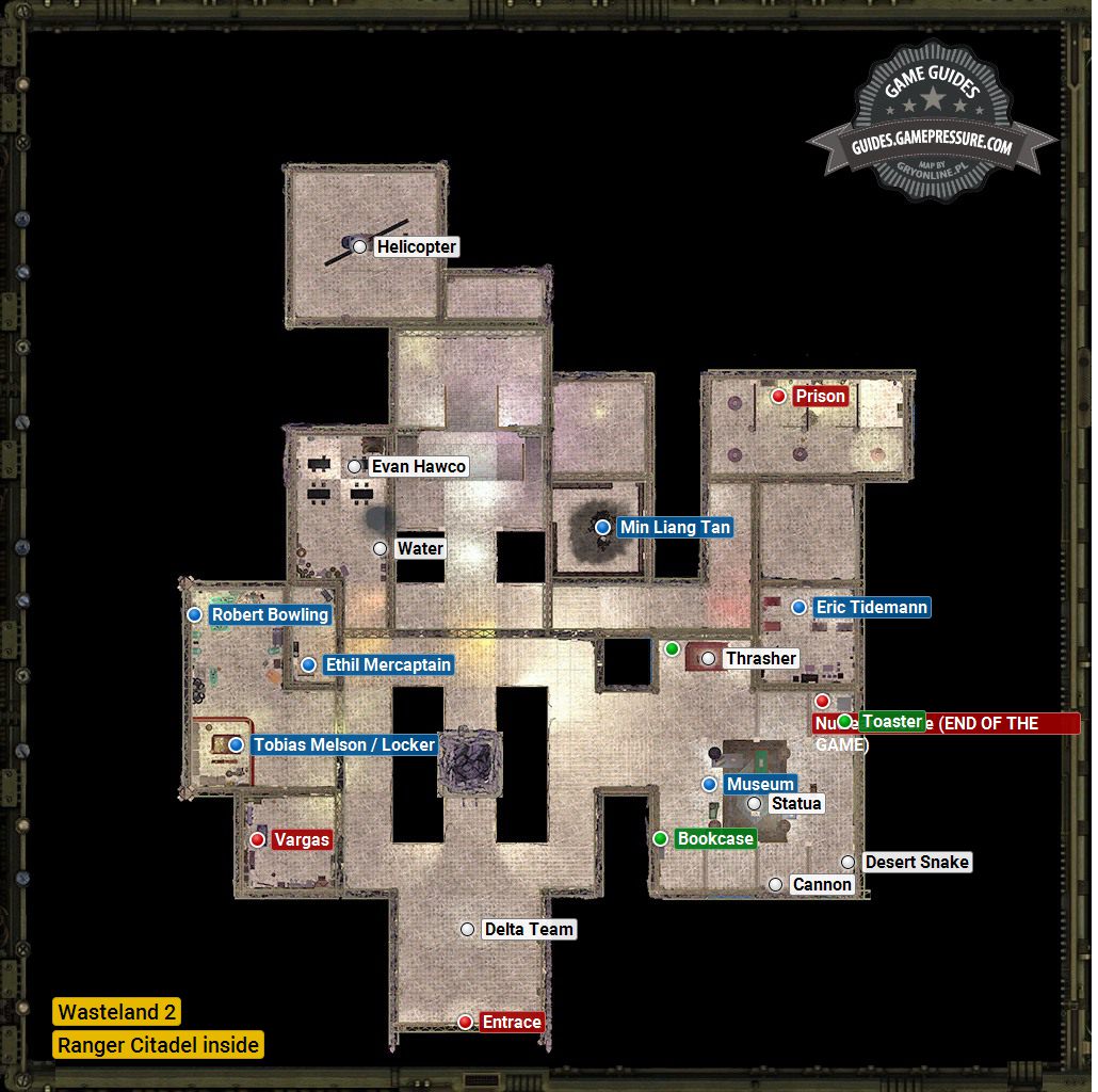 It is the Headquarters of the Rangers. Apart from its obvious connection to the main quests in the game, it also is a perfect place to replenish your ammo, medicine and water. Also, you can buy Rad Suits, or explosives, here. From captain Mercaptain, you will also be able to obtain unique items for completing missions for the Desert Rangers command and for bringing her unique items. The Citadel is a perfect source for cash, if you are selling appropriate items to appropriate merchants (weapons spare parts to Melson, animal droppings to Tan and painkillers to Tideman - up until you bring him the cure for cancer.