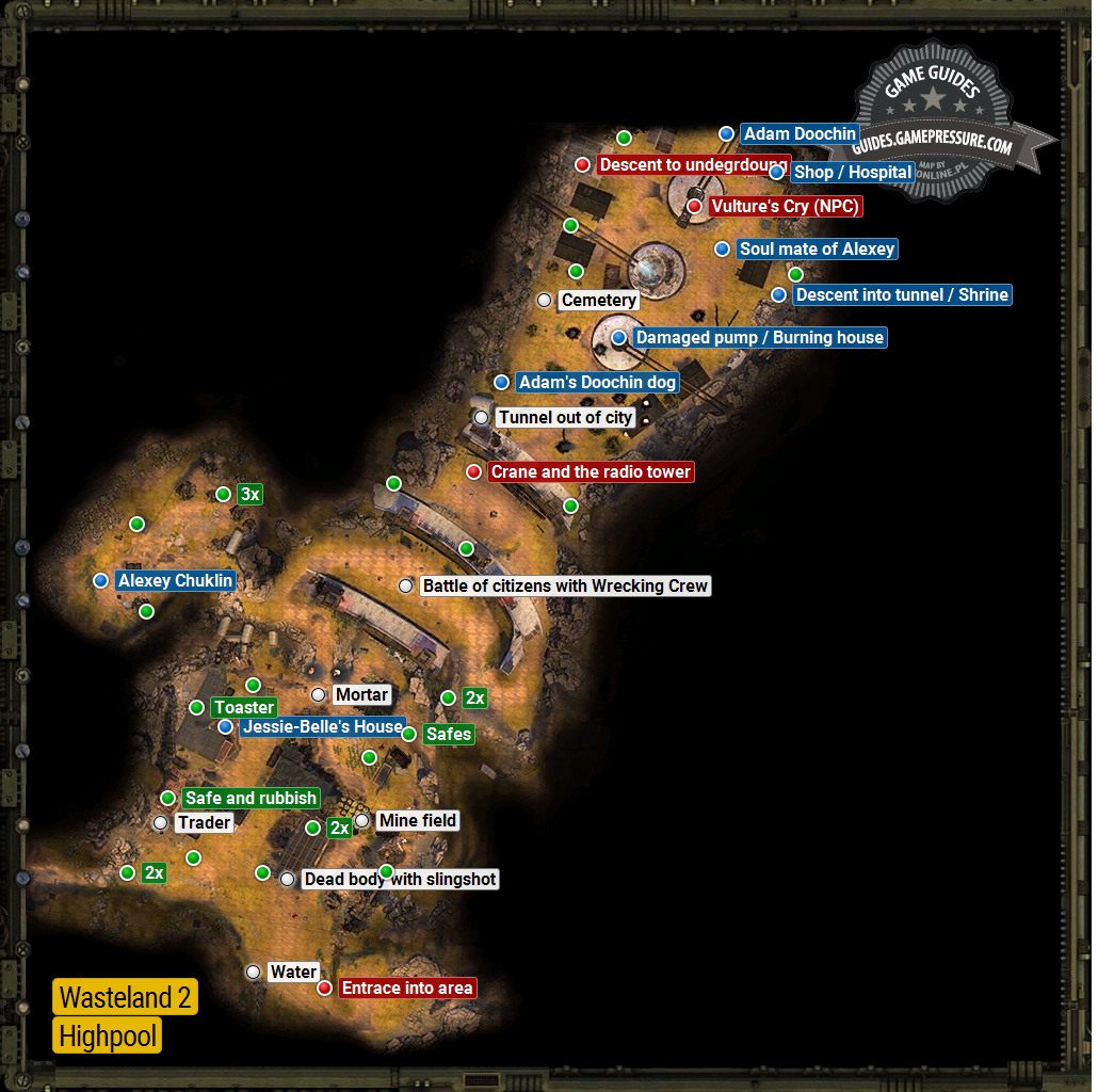 After you have dealt with both issues (the Wreckers and the irrigation system) Highpool will be safe again. The townsmen will then have to elect a new mayor. If you complete side quests and help the men (e.g. you go to destroy the Wreckers' base once and for all), Kate Preston will win the elections the town will be back under the Desert Rangers' jurisdiction. If you are lame at helping them, or you ignore helping them at all, the town will be seized by the Red Skorpions. In the city center, there also is shopkeeper Harold (he does not want to trade with you, if you fix the pump at that room), and a medic dr. Scott Warner, who heals your entire party for free, if you need it (he stops if you attempt to rob his locker).