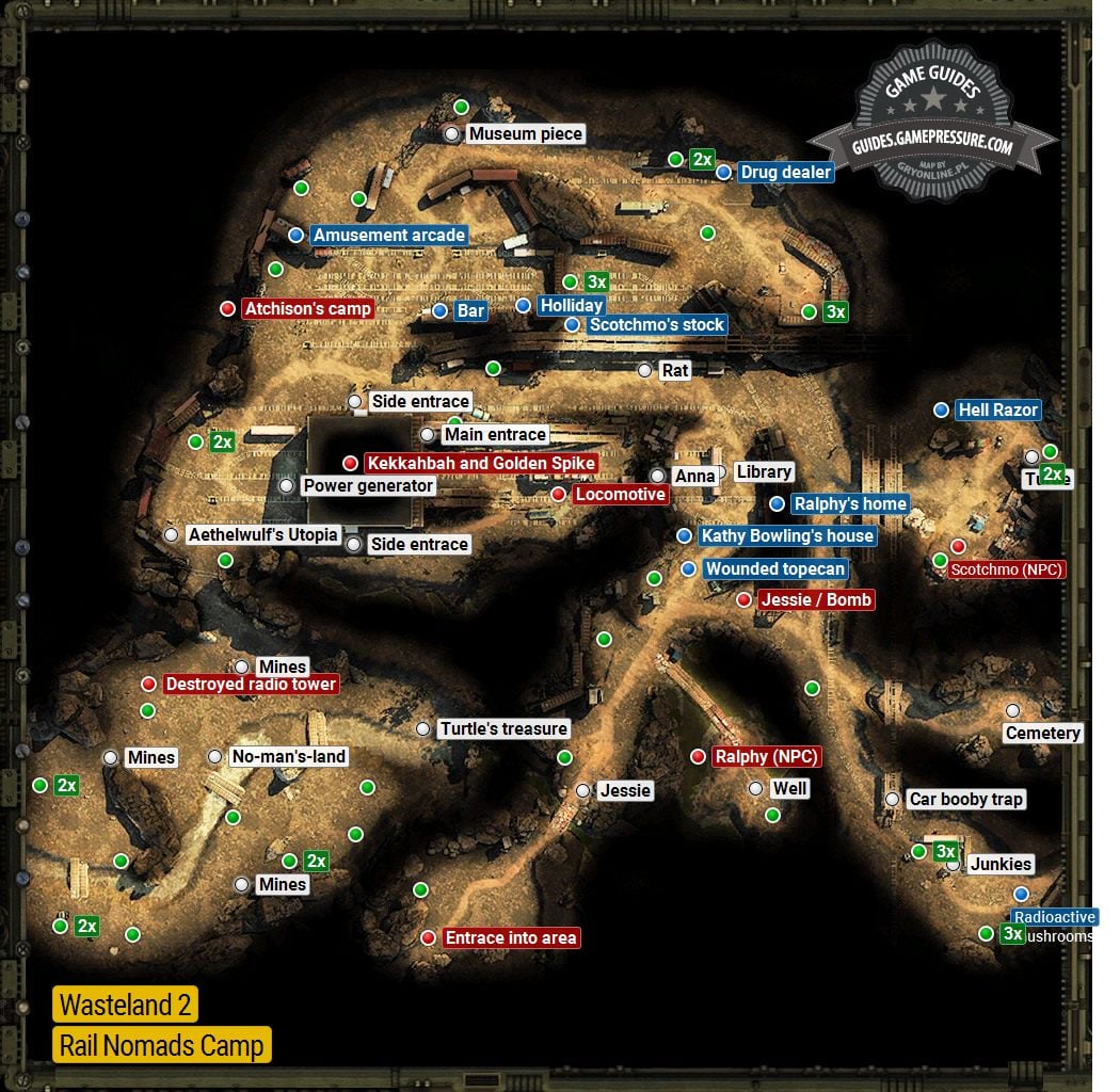 Rail Nomad Camp is in the North of Arizona. It is a completely optional location where lots of things are happening so, it pays off to visit it. You find the camp map right next to Ace's corpse, near the Radio Tower. If you missed it, you can still discover the location of the camp, e.g. during a conversation with Vargas, or with Matt Forrestal at the Ag center. Before you get there, I recommend that you buy Rad Suits. The camp is in a highly irradiated area and the radiation reaches level 3. You can buy the Rad Suits at the Citadel. They provide you with protection against level 2 so, you will sustain slight wounds anyways but, they are not going to be too dangerous. Of course, you can attempt cutting through without protection, but you need to take heavy irradiation into account.