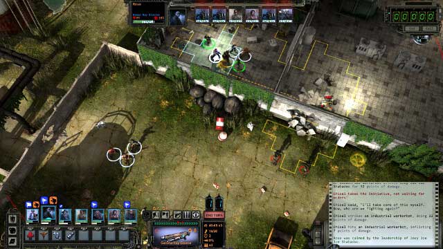 Soon after your visit in Whittier Woodson will contact you and tell you that you can receive suits from him. After you will get to Santa Fe you will also be able to join to your team new character named Brother Thomas who is an ex-member of God's Militia. Before you will speak to Woodson you should leave a part of your team outside of the building, just like on the screenshot above. Once again you will be attacked by surprise. People you left outside can take care of local cans. Right now try to avoid entering the great room. Close to the main doors you will find another three robots however they will not attack you if you will stay out of their sight, so you can focus now on these robots that are close to the hole in the wall.