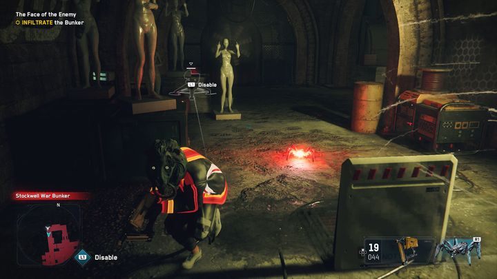 The bunker is full of traps. Be careful on the ground, because there are mines highlighted in red. First room - run fast through it, the mines are behind the mannequins and barrels. The next room is guarded by a turret. If you have the ability to hack or betray, do not destroy it, just turn it off, later you will need it. However, beware of mines near the turret, shoot them down and run to the end of the corridor.