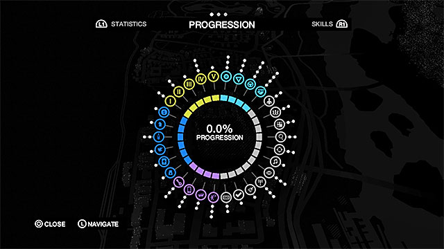 Nearly everything that you do in the game is included into the percentage value of the game completion. A very important piece of information is that the progress in the game you can be looked up at any moment and learn at the same time what else you still need to do. To look up your progress, bring up your smartphone and access the Progression option. On the screen, you should see a dial menu, similar to the one in the above screenshot. Of course, you can view the individual entries and select them from the list, thanks to which you will learn about additional rewards for completing a given branch (e.g. an unique vehicle or a special weapon).