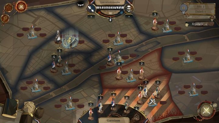Then, the battles for Paris will start. The help will arrive after 10 days. During that time, you must hold as many districts as possible. At the top of the screen, you will find information about how many citizens managed to escape from the city and how many had fallen in combat. Depending on these numbers, your reputation will rise or drop. Thanks to the reputation you will gain, among other things, influence points that enable you to recruit more soldiers.