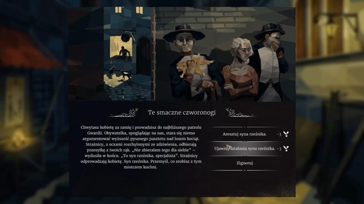 An event will happen. You will meet a woman that was dragging cats in a bag and was screaming that the cats can't be made into pate anymore. You can leave her alone or use 3 influence points to stop her. In this guide, we decided for the latter.