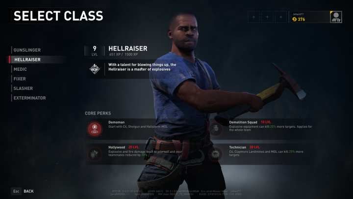 The Hellraiser class is the explosives specialist - a large portion of the class' perks increase the effectiveness of explosive weaponry and gives access to more types of those tools, offering some very powerful boosts to the entire team as well. As you progress in the Hellraiser skill tree, you will be able to increase the effectiveness of explosives - allowing them to blow up more targets at the same time, ignite the area after the explosion or give a chance to plant Claymores at no cost to equipment, as well as and unlock various weapons for short-ranged combat, namely shotguns.