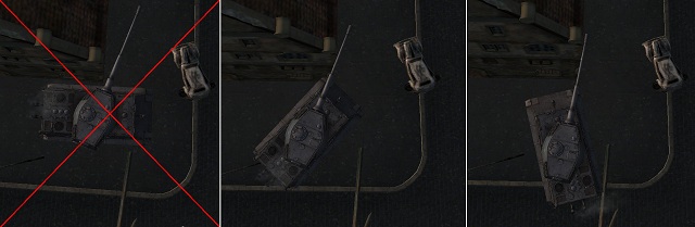 An extension of this tactics is the method of leaning out from behind buildings or ruins. Most of beginners move perpendicular to the opponent, getting shot in the front wheel, thus losing HP and risking breaking the tracks and another series of attacks at the exposed fragment. Proper attack from behind the building should be carried out diagonally with front plate set at the high angle to opponent. Thanks to that, there is a high chance that first enemy shots will ricochet on our armor, making the counterattack possible. After that we should retreat behind the cover. Third method is to set our tank with its side at very high angle, accord to the rule described in previous paragraph. All we risk then is to get hit at tracks and immobilization, but subsequent shots should not cause any harm.