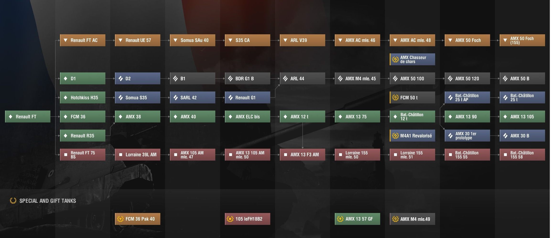 The French tanks available in the game are divided into low-tier pre-war vehicles, and wartime vehicles of high tiers. The former are similar to the vehicles of the other nations, whereas the latter have their own, unique playing style.