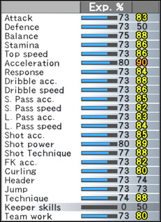 Basic attributes increase/fall off in the Master League mode. Values change too in relation with the current player form.