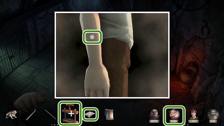 When the guard drink from the mug with poison, in the inventory will appear icon of devil. Click Miguel's icon in the inventory. Click the white pulsating circle on Miguel's left forearm. Use the boot on his forearm, then use piece of cloth and hog's icon (blood) on the forearm. You will get blood-stained piece of cloth.
